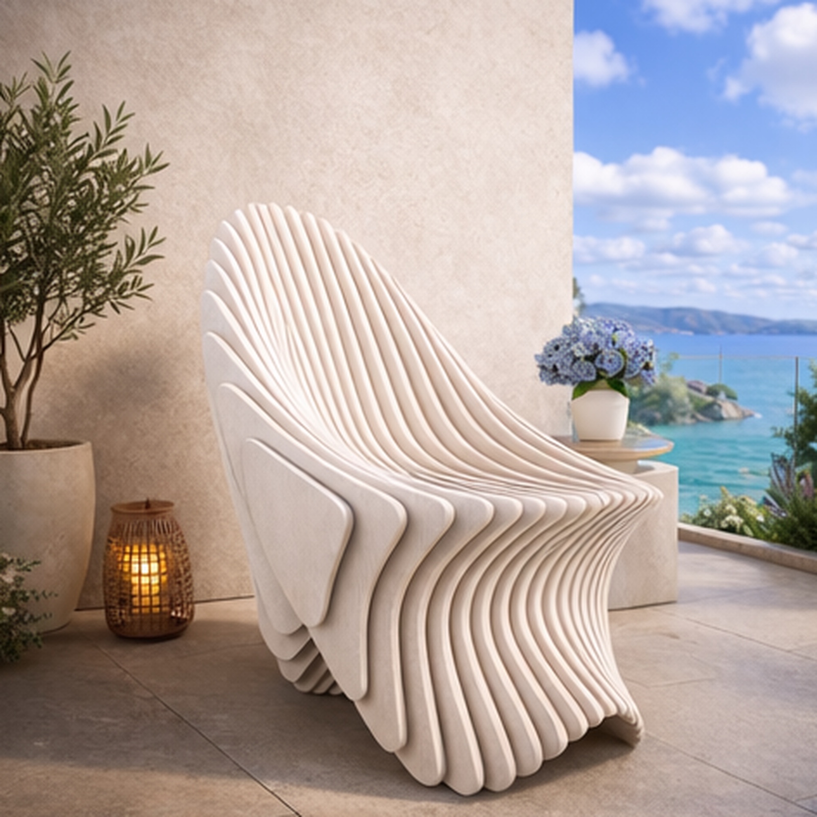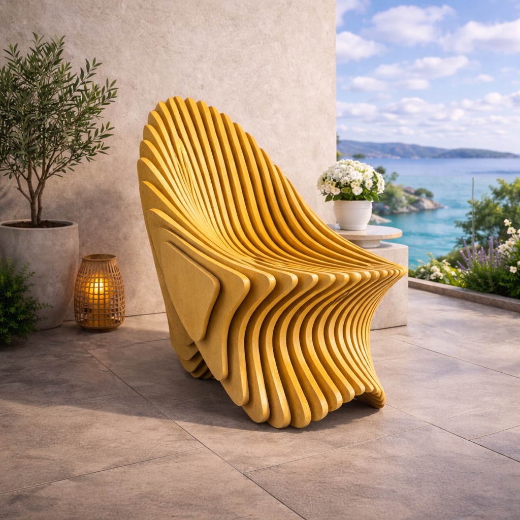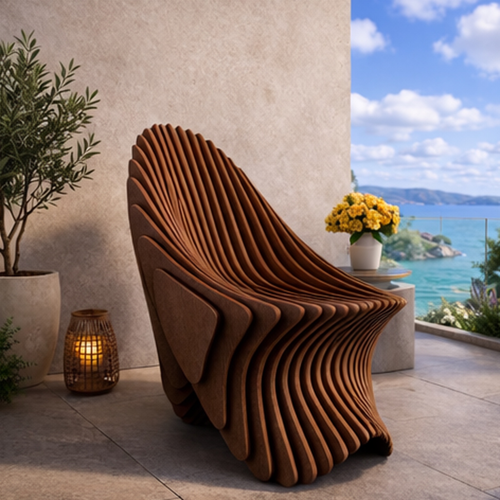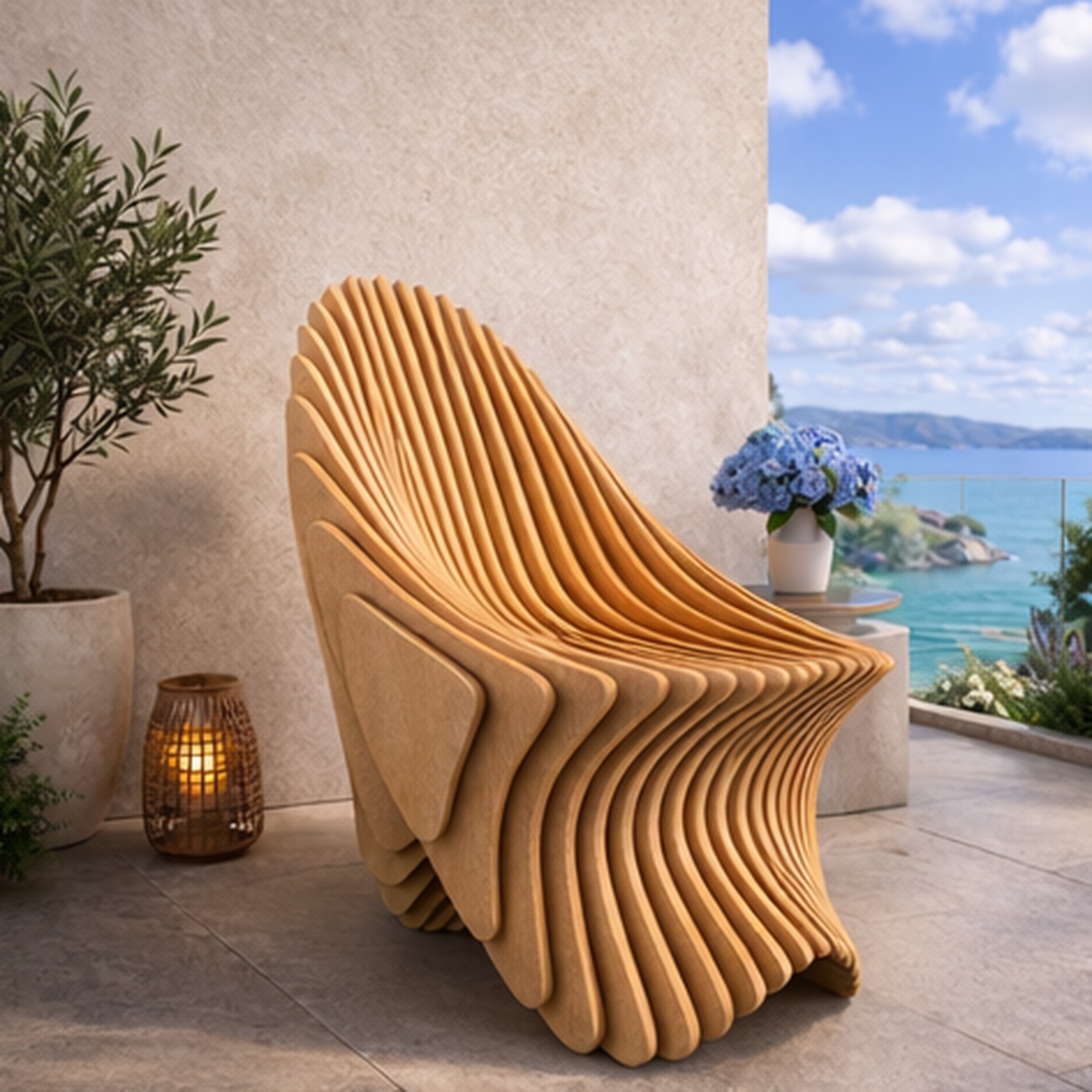 - Sculptural Wooden Chair blends artistic expression with functional design. Carved and shaped from wood, its form emphasizes flowing lines and bold contours that make the chair both a seating piece and a work of art.