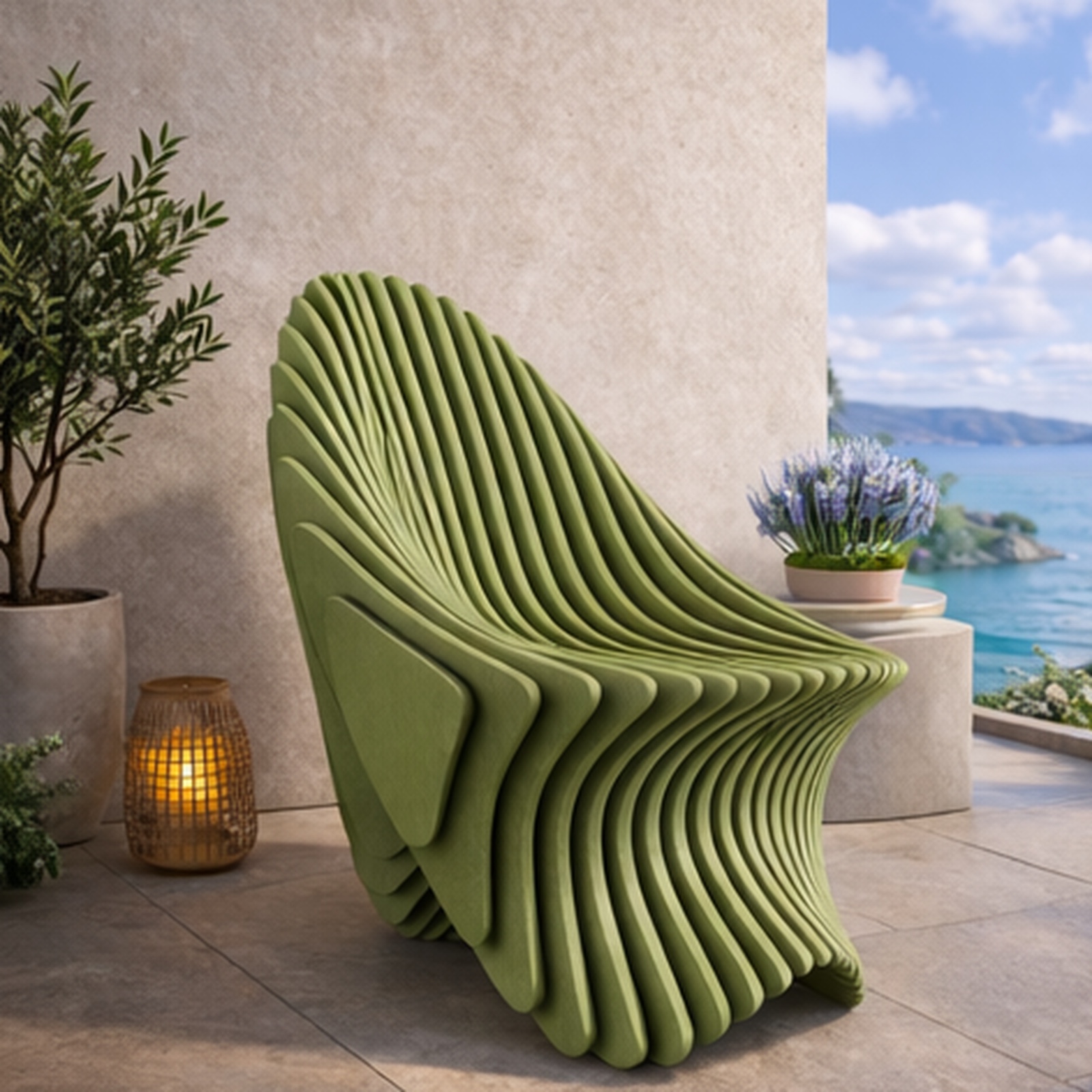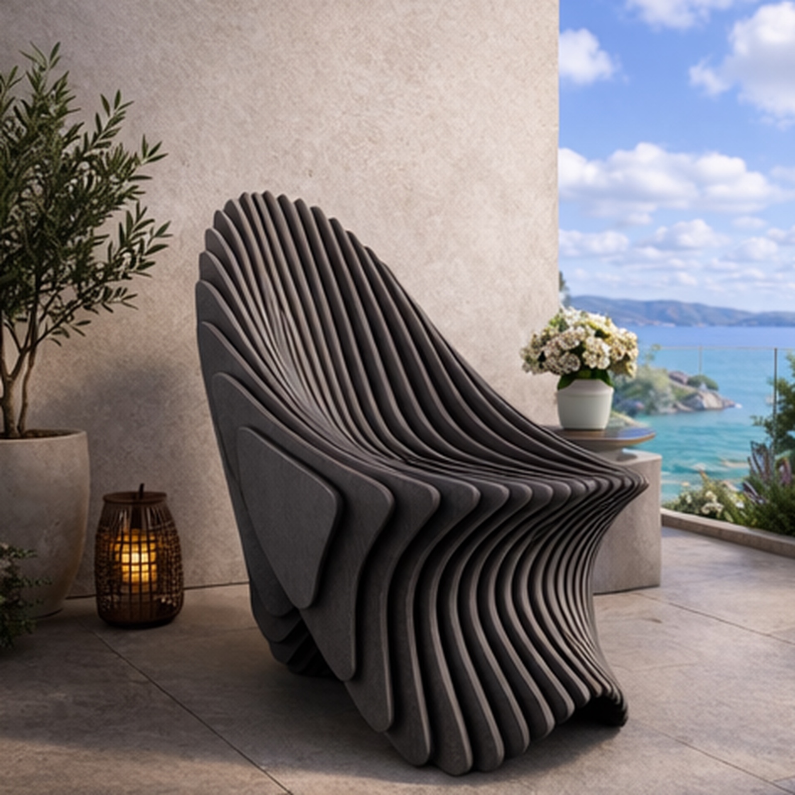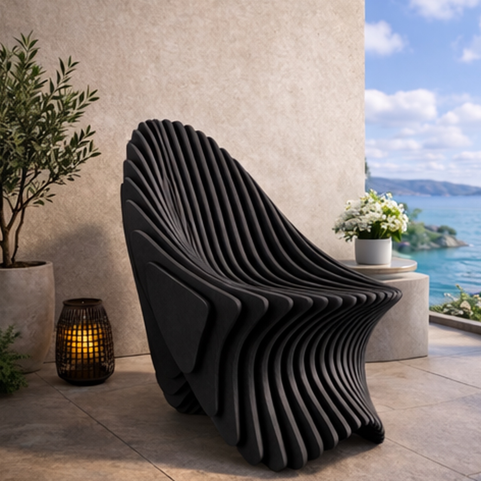 - Sculptural Wooden Chair blends artistic expression with functional design. Carved and shaped from wood, its form emphasizes flowing lines and bold contours that make the chair both a seating piece and a work of art.